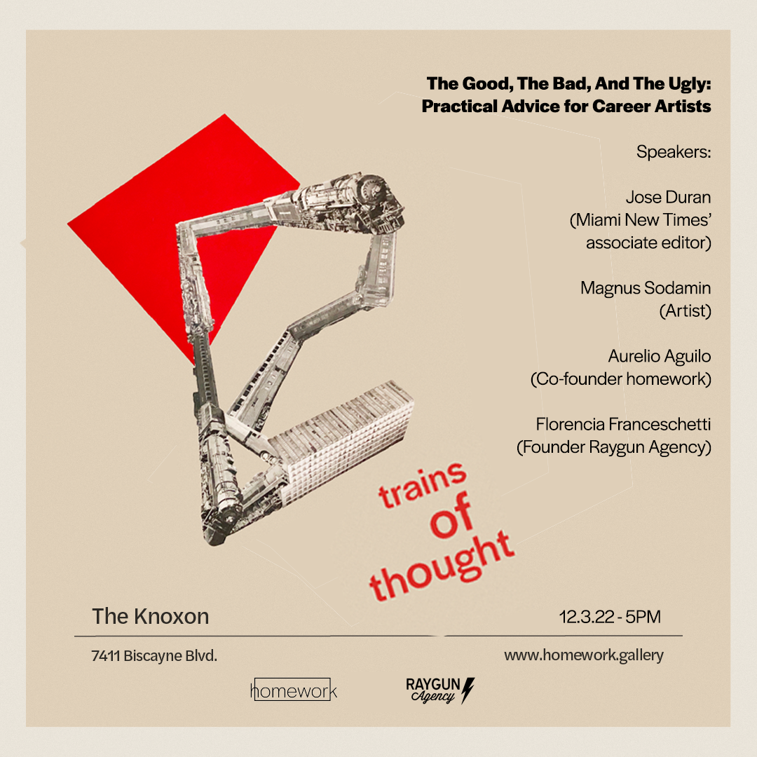 We’ve invited a panel of art industry professionals, to discuss the good, the bad and the ugly (but necessary) things needed to make a career as an artist. In the third event of this kind, homework and Raygun agency are joined by the associate editor of Miami New Times, Jose Duran, and accomplished career artist, Magnus Sodamin. Aurelio Aguilo, co-founder of homework, will be sharing his insight as well. The panel will be moderated by Florencia Franceschetti, journalist and founder of Raygun Agency.